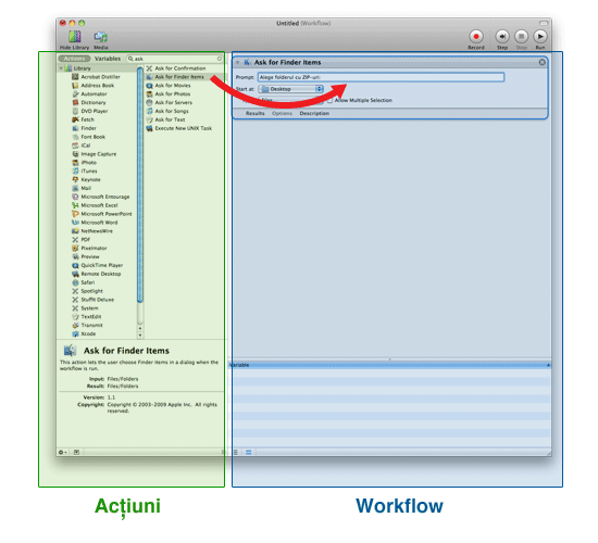 Paranteză. Vă veți întreba poate, pe parcursul acestui tutorial, cum de mi-am dat seama ce acțiuni a trebuit să folosesc la fiecare pas? Păi în primul rând am judecat așa: fiindcă trebuie să fac niște operațiuni de deschidere și mutare a unor foldere și fișiere, mi se pare logic să folosesc niște acțiuni specifice Finder. Apoi, am avut la îndemână două lucruri extrem de utile: