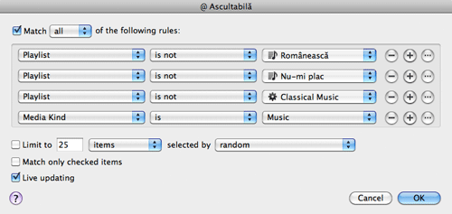 În ceea ce privește sursa melodiilor, putem să configurăm iTunes DJ astfel încât să aleagă melodii din toată librăria iTunes sau numai dintr‑un anumit playlist, inclusiv din playlisturi „smart”. De exemplu eu am diverse genuri de muzică în iTunes. Unele melodii le ascult mai des, altele foarte rar, unele‑mi plac foarte tare, altele nu prea, și de obicei nu amestec genuri complet diferite în acelasi playlist (cum ar fi muzică clasică cu rock). Astfel că pentru uzul zilnic mi‑am făcut un smart playlist ca în figura de mai jos și i‑am zis lui iTunes DJ să selecteze muzica numai din acest playlist.