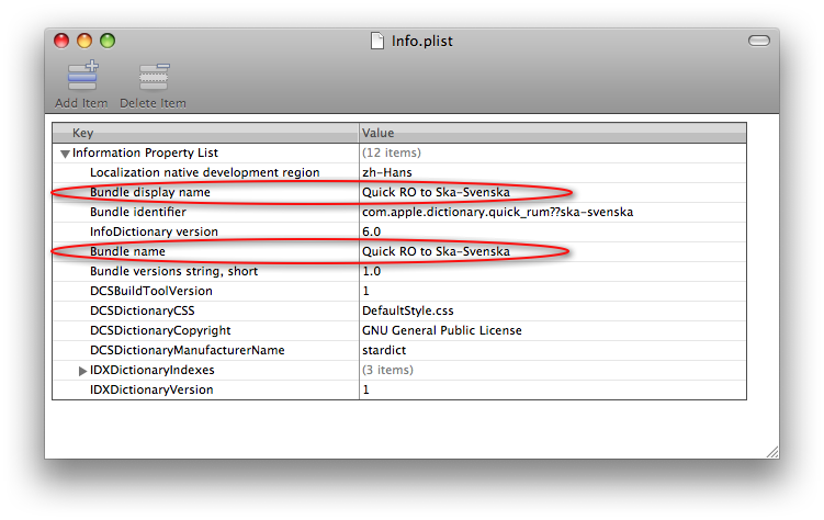 Titlul se modifică din fișierul Info.plist utilizând aplicația Propery List Editor (Suita Xcode) sau TextEdit (Mac OS X) pe care îl găsești aici > /Users/(numele tău)/Library/Dictionaries/quick_rum??ska-svenska.dictionary/Contents/Info.plist > sau > /Library/Dictionaries/quick_rum??ska-svenska.dictionary/Contents/Info.plist (depinde unde l-ai instalat)Eugen, cum fac un titlu mai scurt al dicționarelor și cum fac să aibă diacritice standard, fără ? și fără ˜ în loc de ˘.