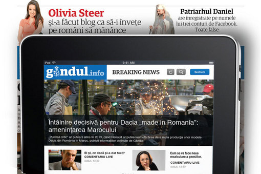 Din 8 aprilie cititorii ziarului Gândul îl vor putea răsfoi doar în varianta digitală, pe internet, pe dispozitivele mobile și folosind noua aplicație pentru iPad, care va fi disponibilă gratuit în App Store. După știința mea este al doilea ziar românesc care oferă o aplicație pentru iPad (prima fiind cea de la Adevărul) și sper să fie ceva mai mult decât o variantă împachetată a sitului. În privința aplicației de la Adevărul am două nemulțumiri. Prima: conținutul nu este actualizat în același ritm cu situl. A doua: mizeriile de comentarii care sunt puse pe site ajung și în aplicație. Aș prefera o moderare mult mai strictă a comentariilor, măcar în ediția de pe iPad.
